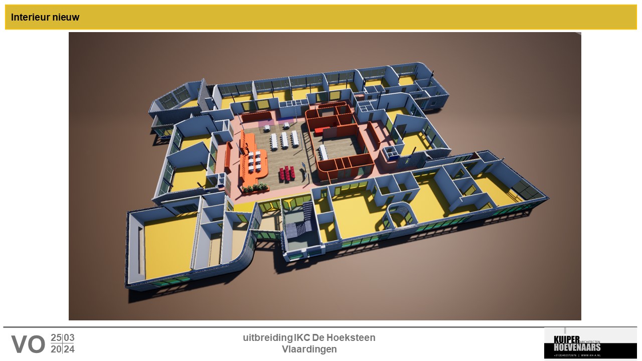 Antwoord: Het huidige gebouw krijgt een upgrade. Hierbij kunt u denken aan een verbeterd binnenklimaat, verbetering van toiletgroepen, een vernieuwde binnenruimte in de school, voldoende spreekkamertjes, etc. Het voelt straks als één geheel wanneer u de school zowel aan de binnen- als buitenkant ziet.